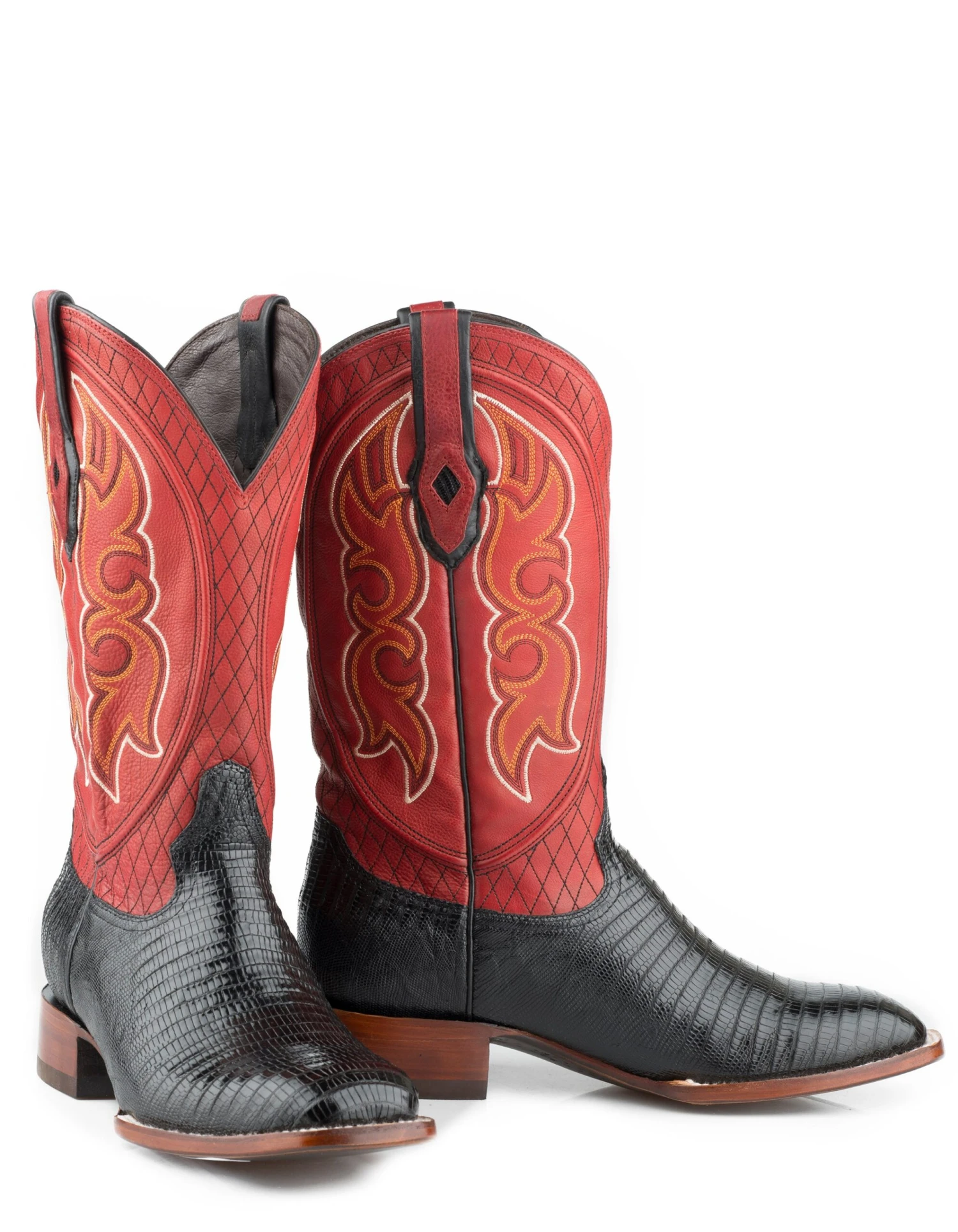 Black Teju Vamp * Red Matte 13″ Shaft * Intricate Hand Stitching & Cording * Channel Welted Full Leather Construction * 56 Lemonwood Pegs & 8 Premium Brass Nails Per Boot * Leather Lined Poron Insole * Beveled Bottom Sole * Leather Heel