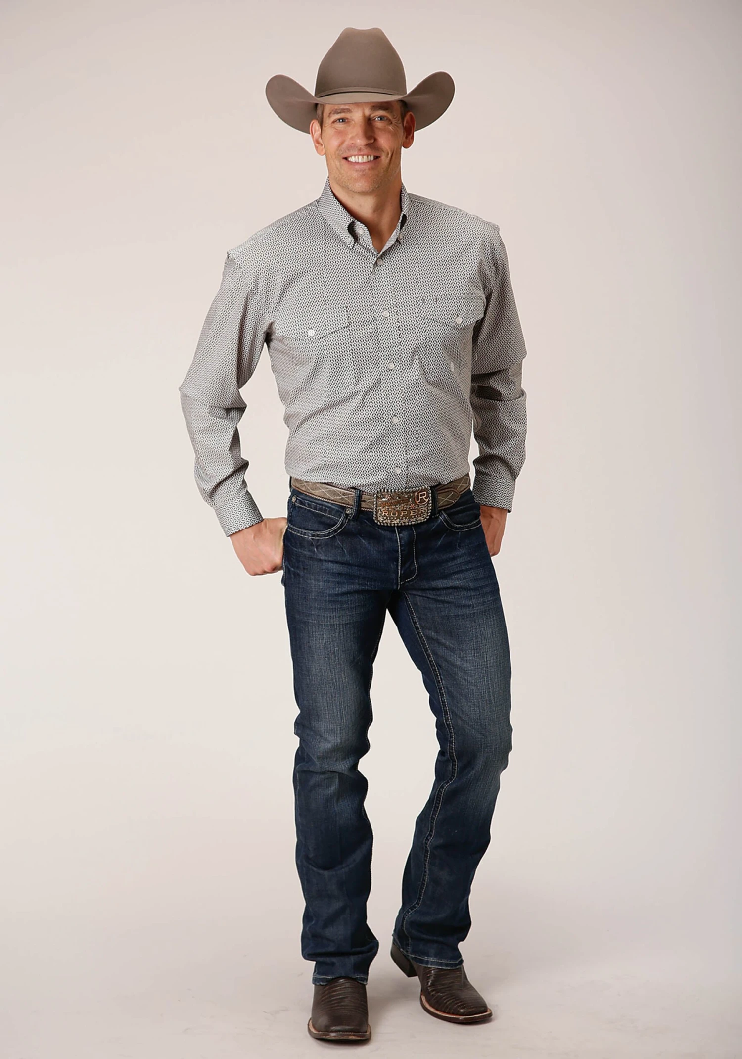 Men’s Long Sleeve Shirt * Bttn Dn Collar * 1 Pt Back Yoke W/Pleat & Locker Loop * 2 One Point Pkts & Flaps * Roper “R” Embroidery