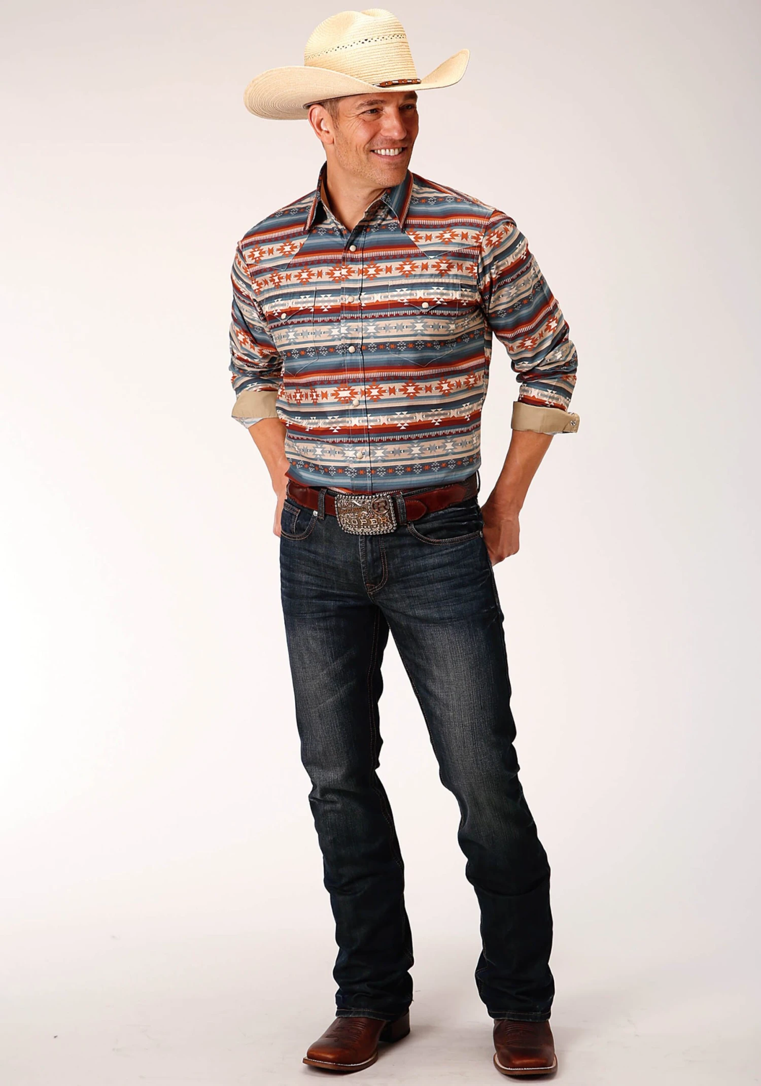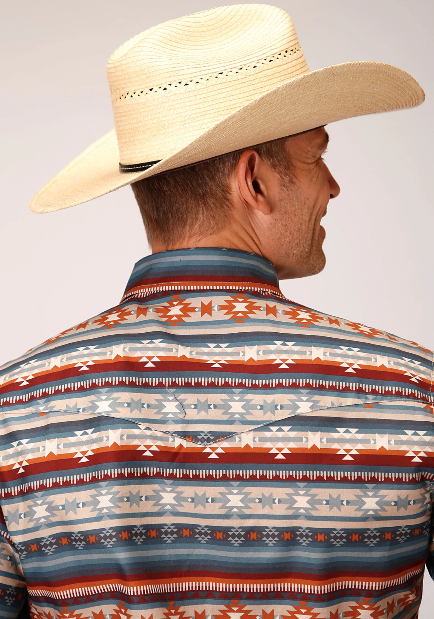 Men’s Long Sleeve Shirt * Horizontal Aztec Print * 1 Pt Front & Back Yokes * 1 Pt Curved Pockets & Flaps * 3 Snap Cuff * Poplin Inside Trim * Opaque Snap Front * Garment Washed
