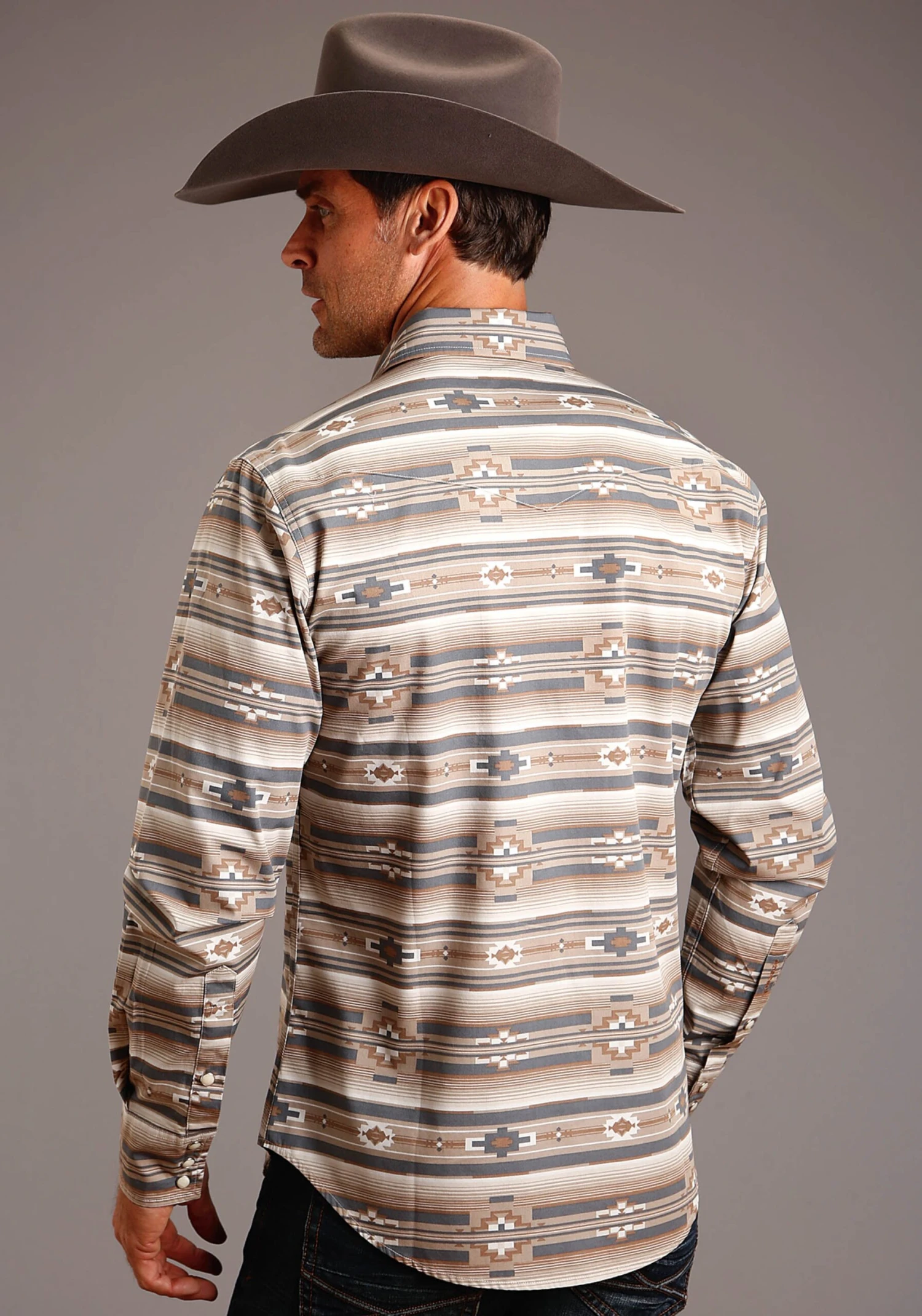 Horizontal Aztec Print On Cotton Poplin * 1 Pt Curved F/B Yokes * Stetson “S” Emb * “Stetson” Emb On Right Slv Placket * Logo Snap Front * 3 Snap Cuff * Garment Washed * Modern Fit