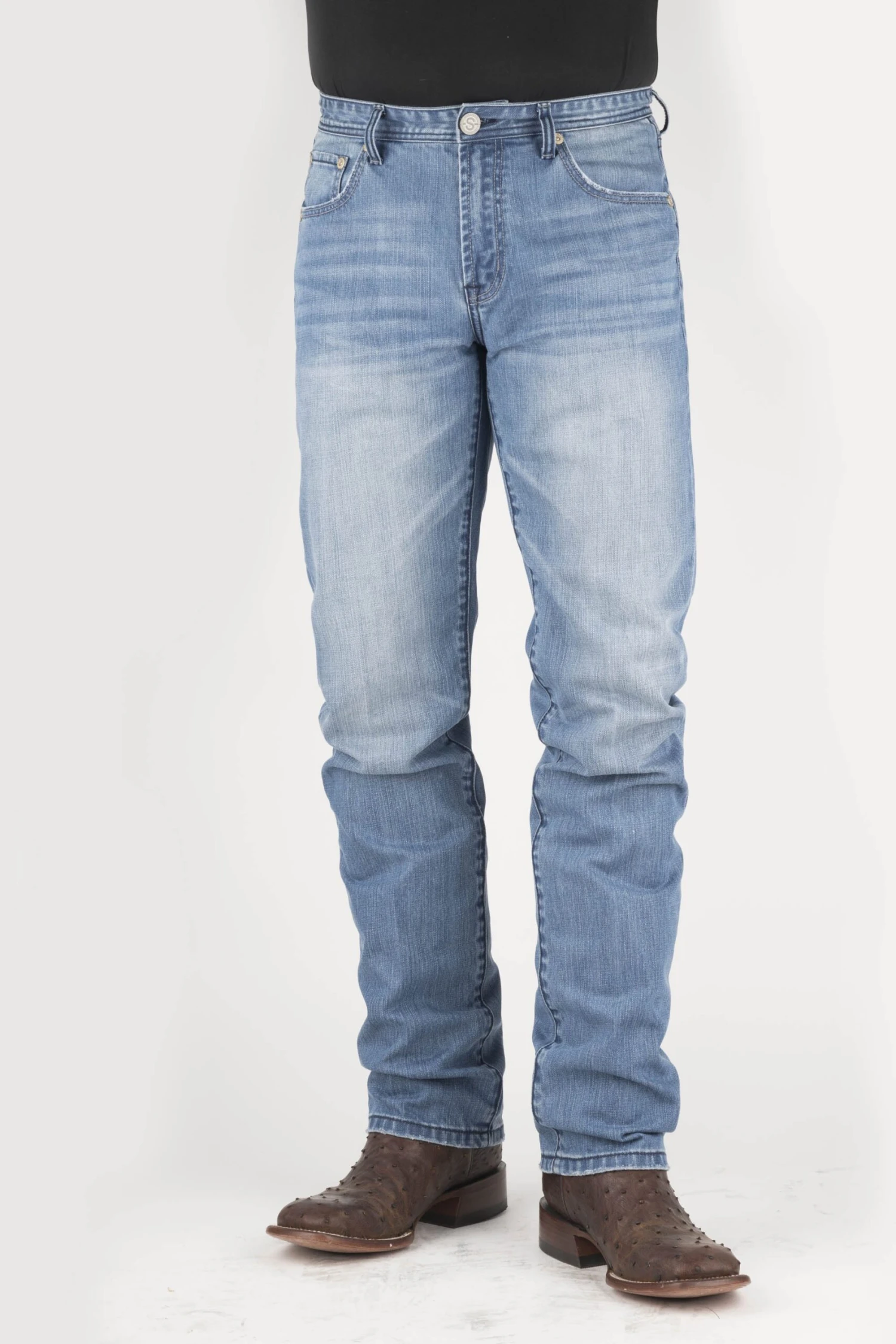 Slightly Lower Rise * Straight Cut Thigh * Straight Cut Leg Opening * 5 Pocket Style * X Shape Stitching On Back Pocket * Stetson Branded Buttons, Rivets, And Zipper * Hand Sanding And Whisker Details