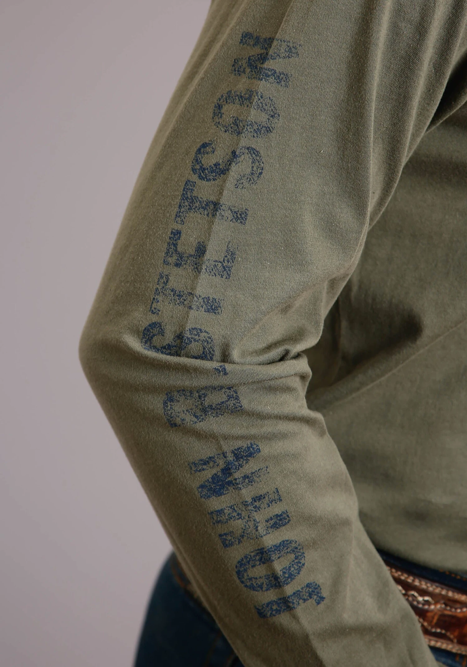 Men’s Green Long Sleeve Jersey T-Shirt * Crew Neck W/Rib Knit Collar Band * Garment Washed For A Super Soft Hand * Cover Stitched Hem * Navy “John B. Stetson” Left Chest Screen Print And Right Sleeve Screen Print * 100% Cotton